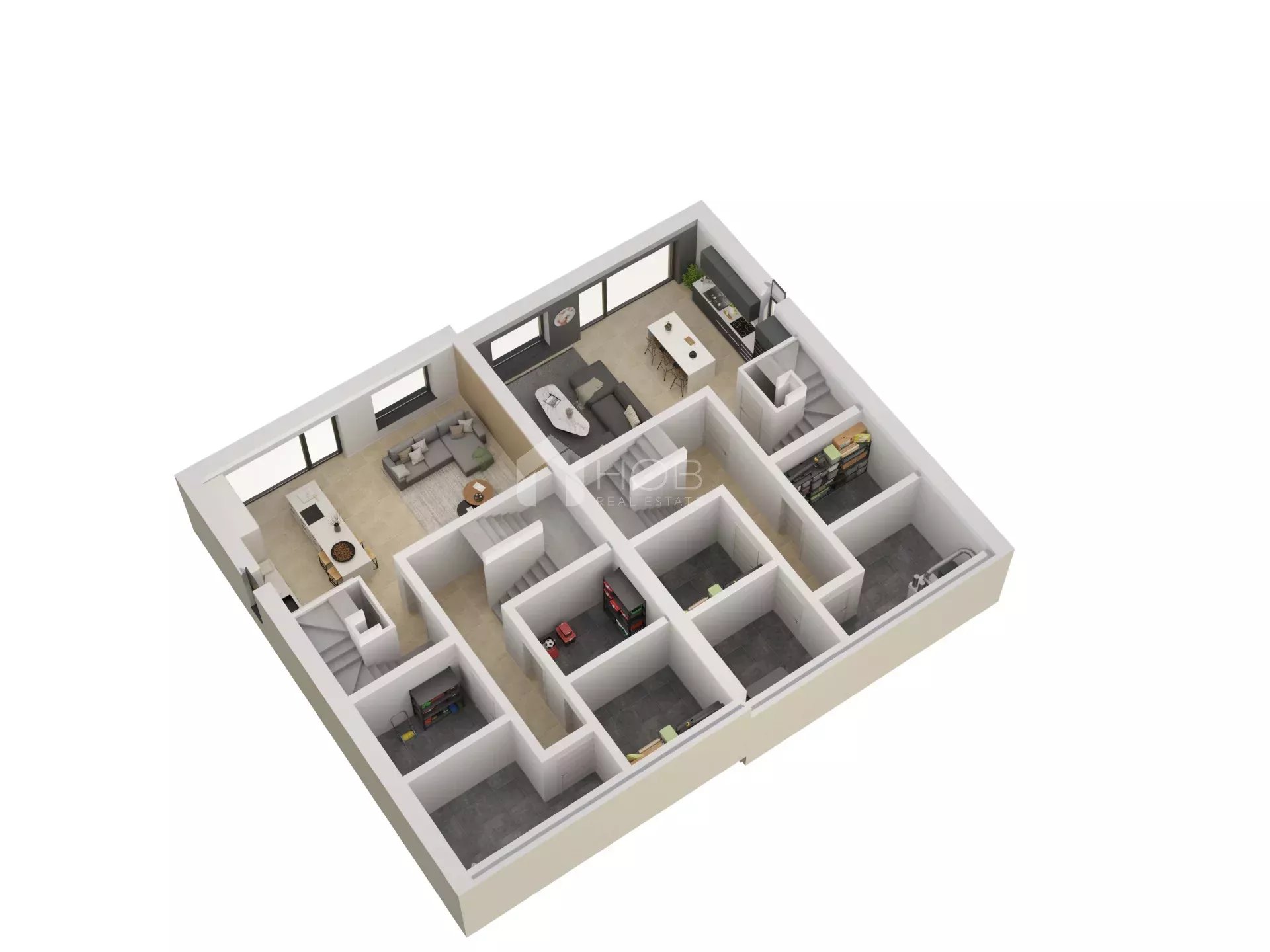 Appartement A1 et B1 : Ces deux appartements se répartissent sur le sous-sol et le rez-de-chaussée. Ils offrent chacun 2 chambres à coucher, un salon spacieux, une buanderie, une salle de bains avec douche et WC, une terrasse, une cave et une place de parking intérieure et extérieure.