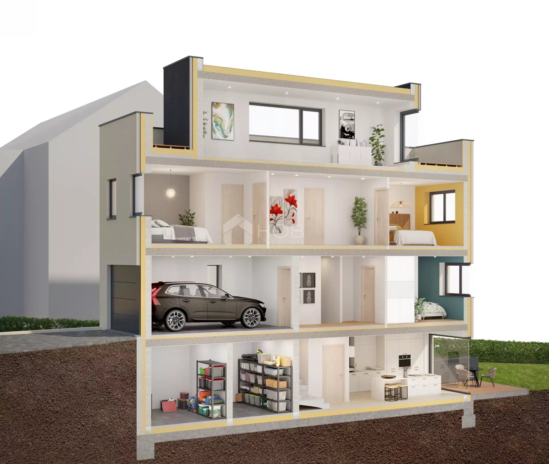 Appartement A2 et B2 : Ces deux appartements sont répartis au 1er et au 2ème étage. Ils comprennent chacun 4 chambres à coucher, un salon accueillant, deux salles de douche, un WC séparé, une terrasse, une cave et une place de parking intérieure et extérieure.