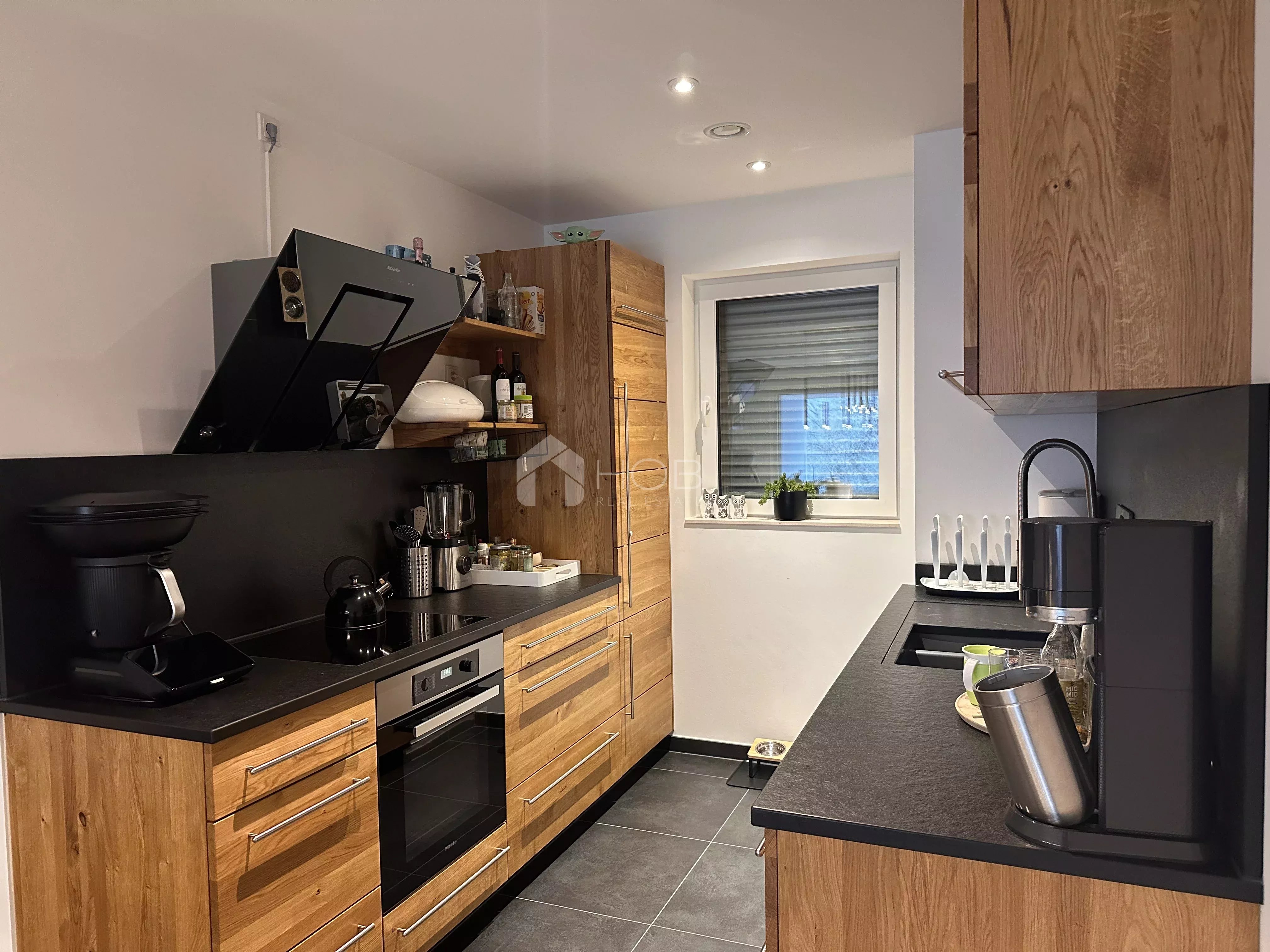 Deux places de parking intérieures et une cave complètent l’appartement.